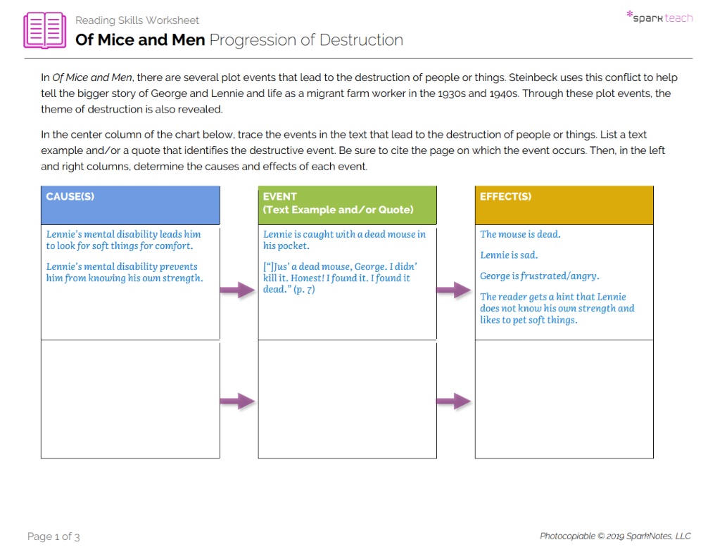 Steinbeck carefully weaves events—both big and small—that detail the destruction of people, things, and even ideas throughout the novella Of Mice and Men. Students will use this worksheet to trace the examples of destruction in the story, identifying the causes and effects of each event. Pass out the worksheet after students have finished reading the text. Students can complete the work individually, in pairs, in small groups, or even as a whole-class activity.