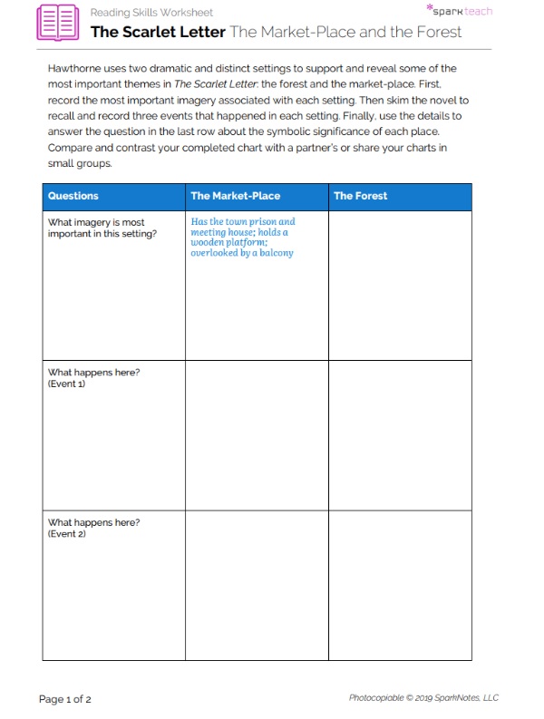 The setting of The Scarlet Letter changes from chapter to chapter, from indoors to outdoors and from daytime to night, and these changes affect both plot and theme. Students will use this worksheet to explore two of the most dramatic settings in the novel, the market-place and the forest. Hand out the worksheet after the class has finished reading the entire text. Give students the opportunity to discuss the possible opposing symbolic meanings of the two settings, such as exposure/secrecy, public/private, governed/wild, controlled/chaotic, or hypocrisy/honesty.