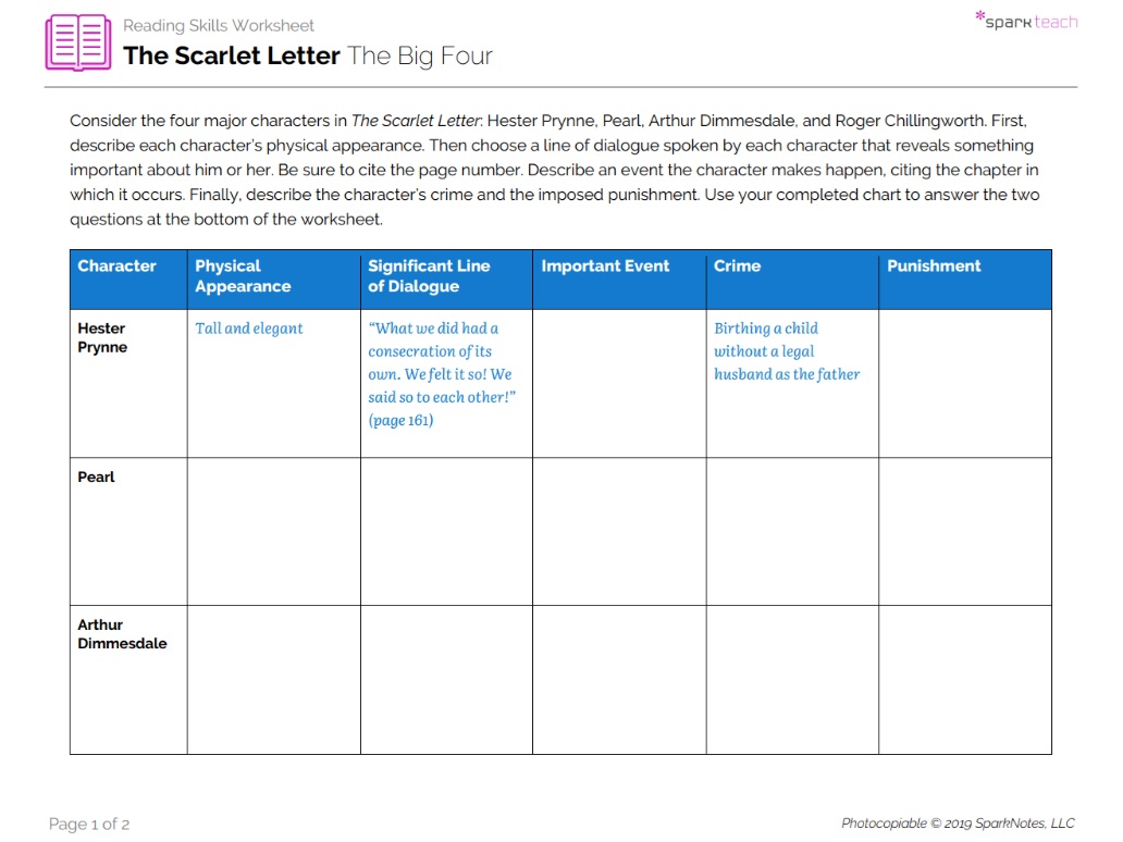Authors reveal important information about their characters by carefully crafting their appearances, dialogue, and actions as well as in what other characters think and say about them. Students will use this worksheet to examine the main characters in The Scarlet Letter, identifying their physical traits, important actions, and supposed crimes. Let the answers in the last column inspire a class discussion about the appropriateness, the severity, and the consequences of the various kinds of punishments.