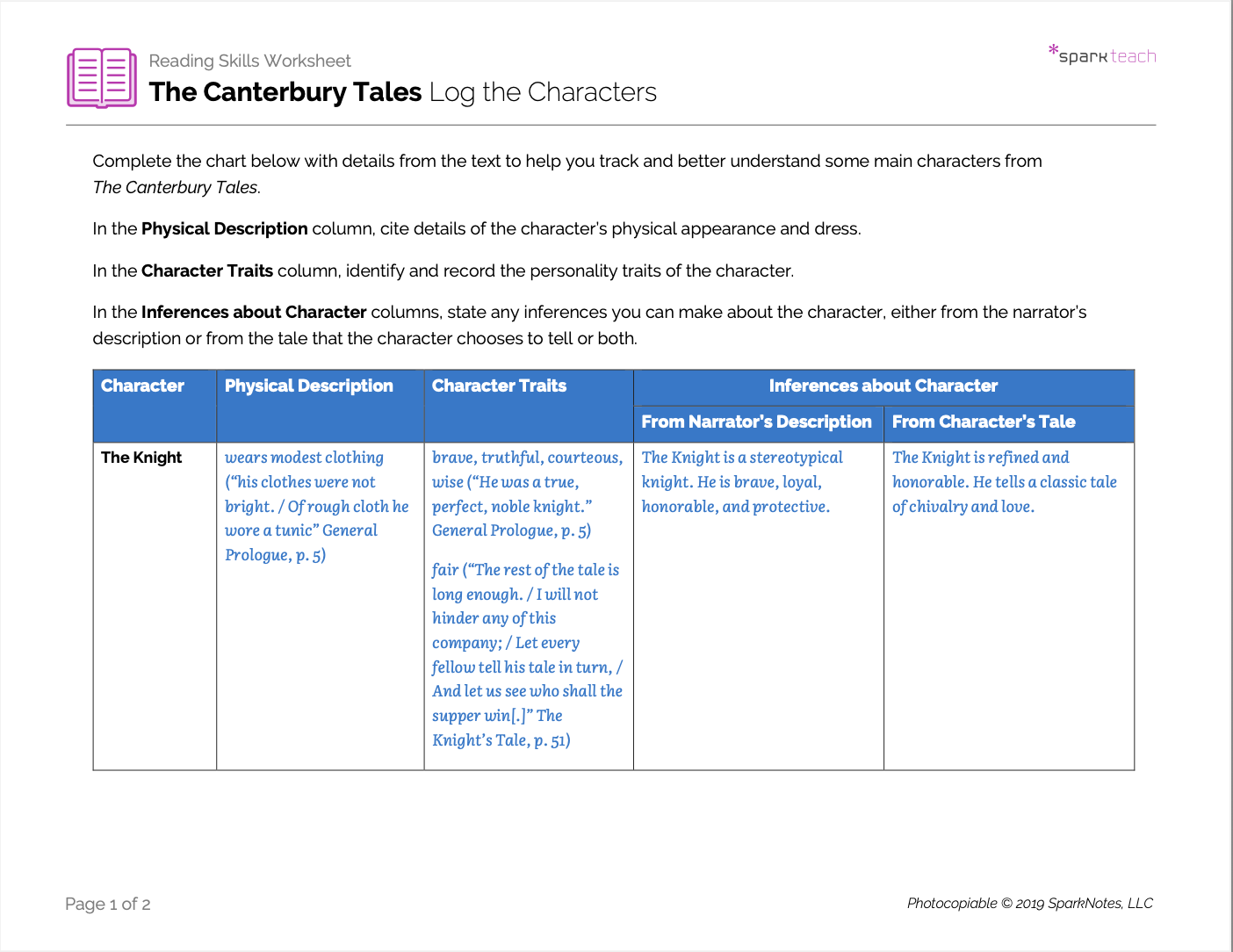 The Canterbury Tales is rich in characters who are both stereotypes of medieval class members and individuals in their own right. Identifying and analyzing character traits helps students better understand how each character fits within a complex web and contributes to overall themes. Students will use this worksheet to track four major characters from the text and identify stated and implied character traits.