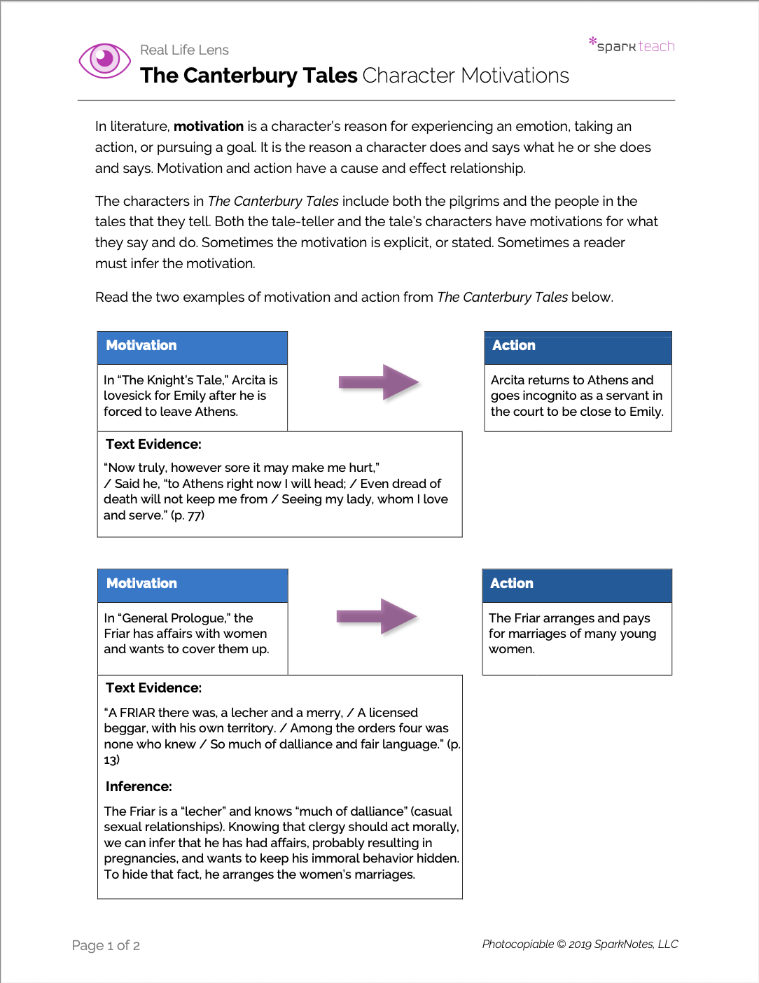Pass out the worksheet after students have read “The Knight’s Tale.” Review as a class the examples provided from “General Prologue” and “The Knight’s Tale.” Review the process involved in making inferences about character motivation. Tell students we make inferences by using what the text tells us plus what we know about the world and people in general, and then we come up with an inference, or reasonable explanation, for a character’s actions.