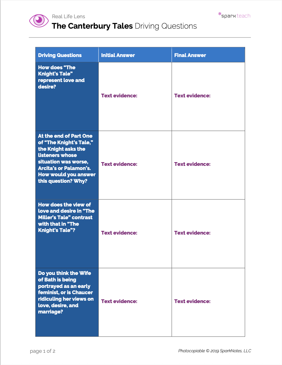 Hand out the Driving Questions Worksheet. Review the questions as a class. Students should enter initial answers to the questions as they read The Canterbury Tales. They will revisit the questions and revise their answers following the lesson activities, classroom discussion, and the completion of the text. Remind students to support their responses with text evidence.