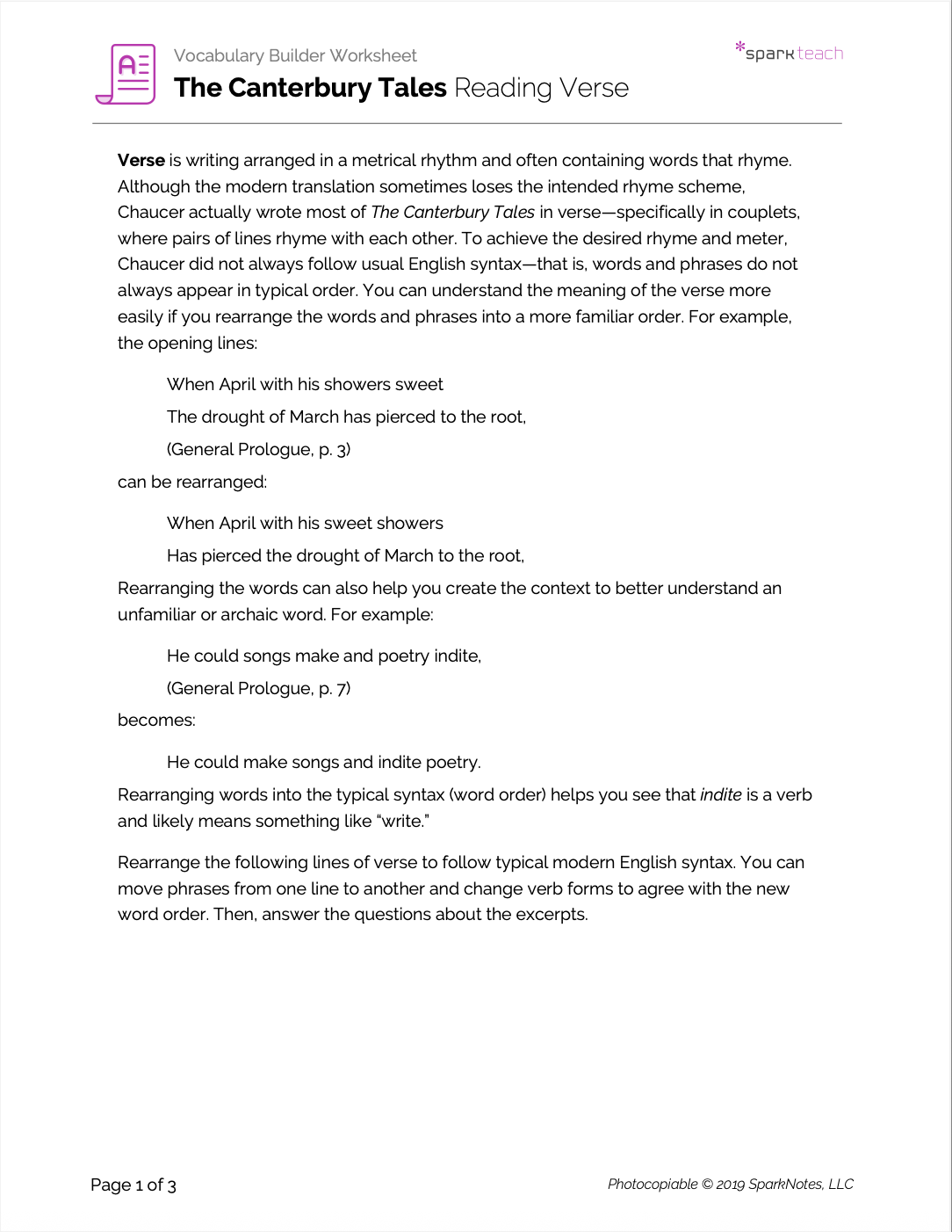 Reading verse such as that found in The Canterbury Tales can present difficulties even for proficient readers. Confusing syntax and archaic language are two of the most common reasons students struggle with this text. Use this worksheet to help students develop a strategy for rearranging verse into a more easily understandable sentence syntax. Demonstrate to students that they can identify the meanings of difficult words by doing simple translations into modern English. This will build confidence with reading verse and improve students’ understanding of and engagement with the text as a whole.
