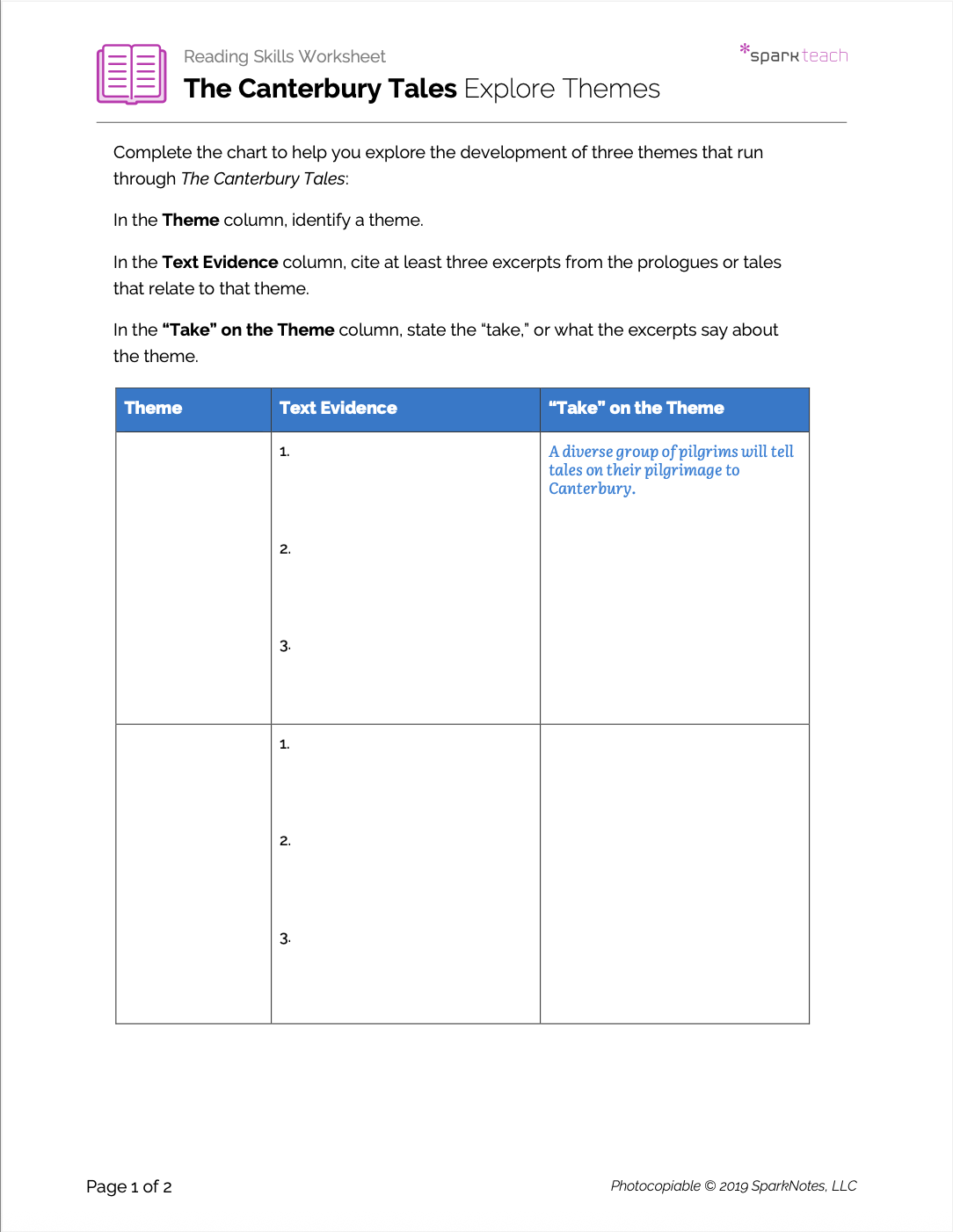 The Canterbury Tales is a complex and multi-themed text. Students will use this worksheet to identify three of the text’s major themes and support their findings with evidence from the text. They will then summarize the “take” on the theme, or the message the author is trying to impart. Encourage students to track themes as they develop across individual prologues and tales. Looking for commonalities across the tales helps students appreciate the richness of this text and understand how seemingly different parts of a text can work together to build a cohesive whole.