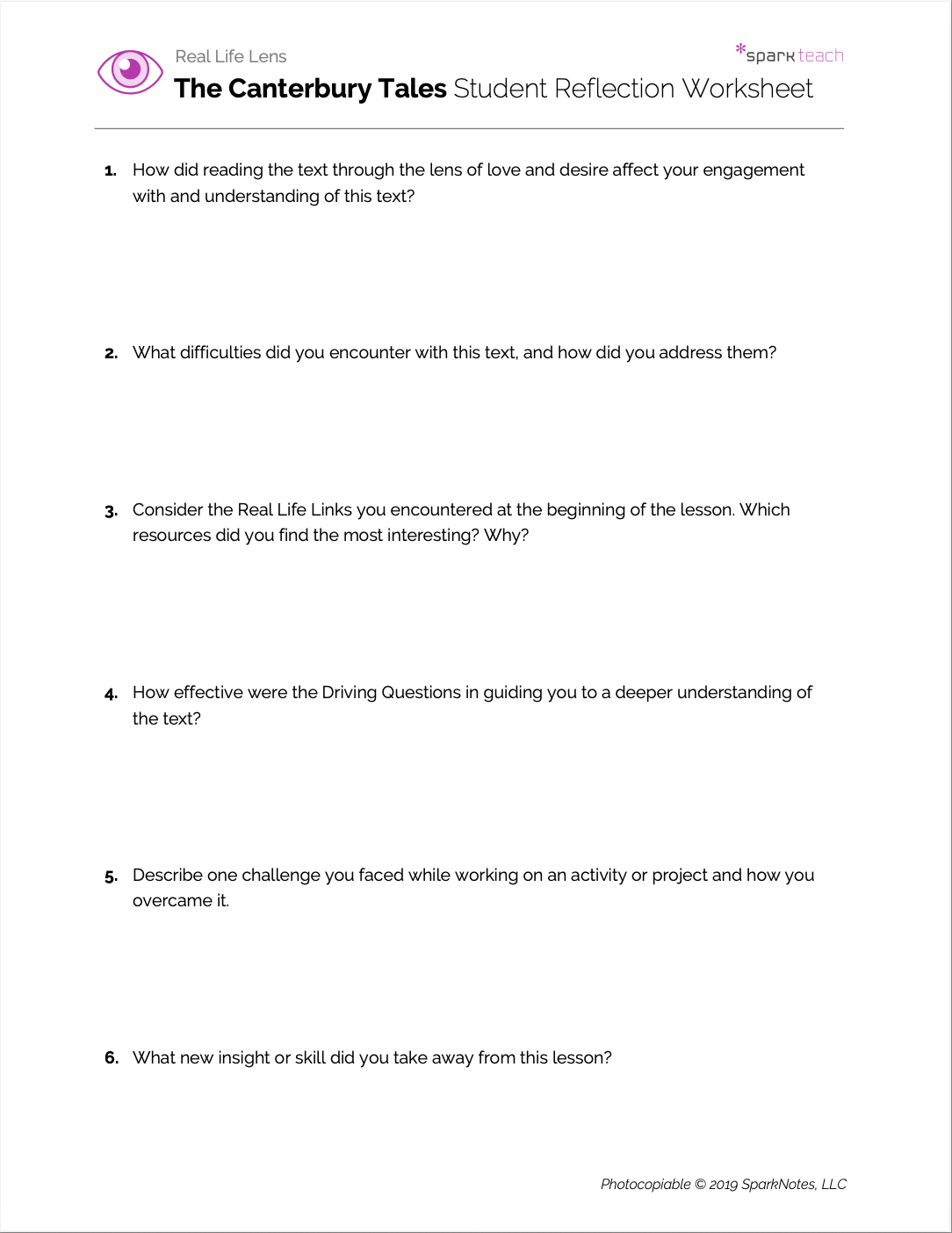 Use this Real-Life Lens Plan to help students dive deep into Chaucer’s The Canterbury Tales and examine the text’s characters and their tales through the lens of love and desire. How did people in medieval times view love and desire? Is the way we view love today influenced by a notion of love from more than 600 years ago? How do love and desire influence the actions we take and the decisions we make?