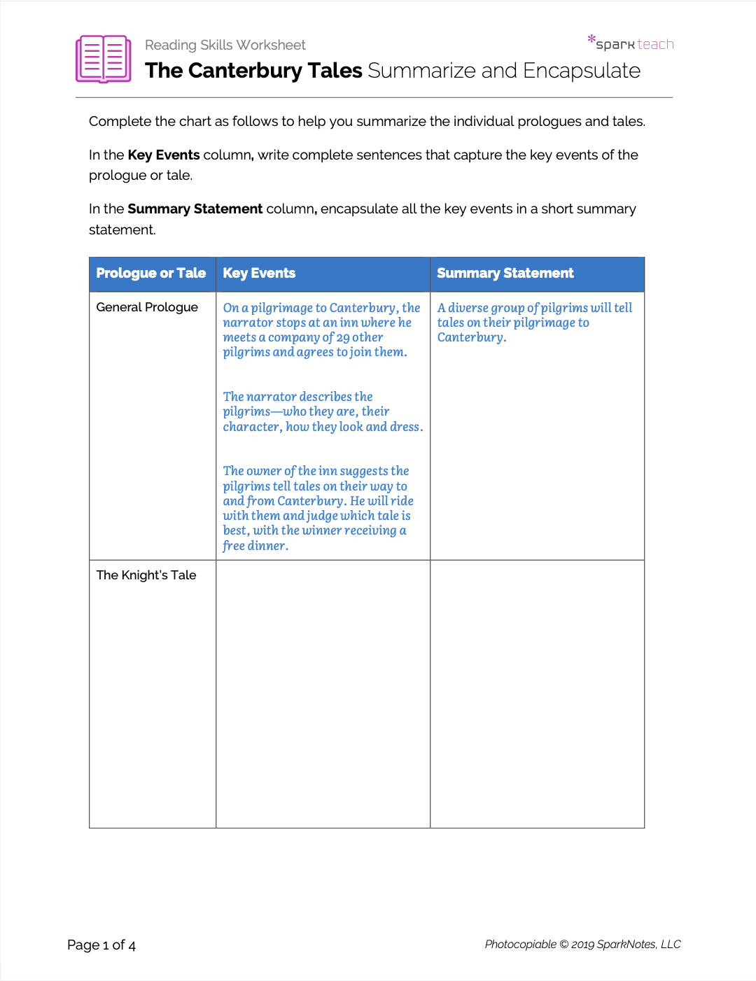 Summarizing a plot helps students solidify their comprehension of a text and forms a foundation for deeper analysis. Students will use this worksheet to track key events in individual prologues and tales and then encapsulate them in summary statements. Consider using this worksheet as students read The Canterbury Tales so that details of each prologue and tale are fresh in their minds. They will then be able to refer to the worksheet when completing their final projects.