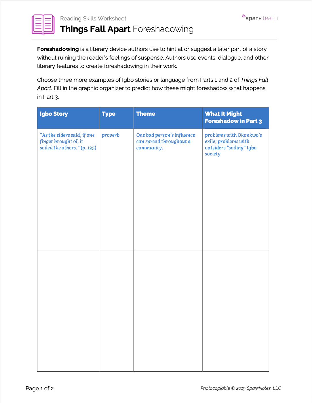 Foreshadowing is a literary device used in many major works of literature and is therefore an essential device for students to be able to identify and understand. Students will use this worksheet to identify foreshadowing in Things Fall Apart and analyze how Achebe uses stories to foreshadow key dramatic events that occur later in the novel. Pass out the worksheet when students finish reading Parts 1 and 2 and before they read Part 3. Make sure to review the definition of foreshadowing before students begin.