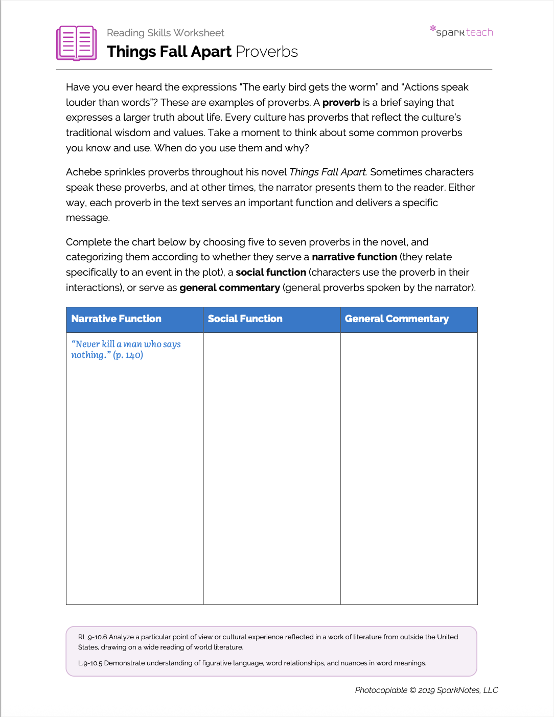 Achebe’s choice to include so many Igbo proverbs in his novel Things Fall Apart was strategic and sends an important message about representing culture in literature. Students will use this worksheet to analyze the use of proverbs in the text by categorizing them according to their narrative function and purpose. Take time to review the description of proverbs at the beginning of the worksheet with the class. Encourage discussion about proverbs in the students’ cultures. You may wish to have students fill out the worksheet as they work through the novel or at the end of their reading.