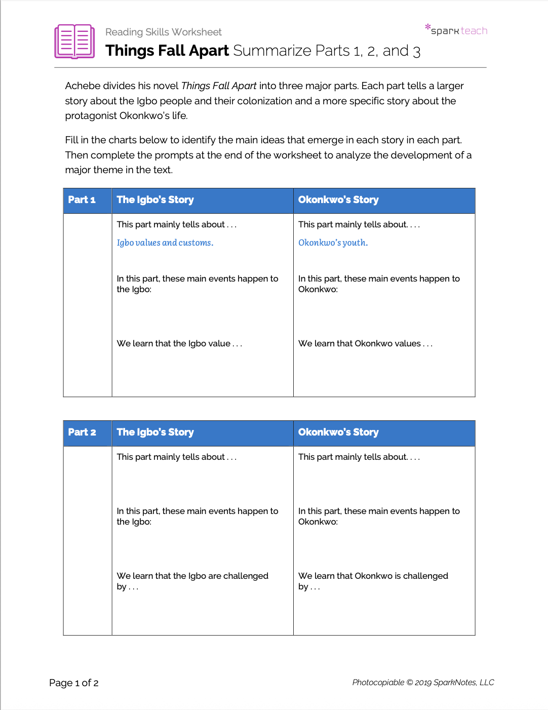 Being able to summarize a complex story is a critical skill for students and reflects their ability to identify a story’s important details and synthesize those details into a succinct statement. Students will use this worksheet to summarize the three major sections of Things Fall Apart and analyze how each part advances the two major stories of the novel: the story of the colonization of the Igbo culture and the story of Okonkwo. They will then use their summaries to analyze the development of a major theme that they identify.