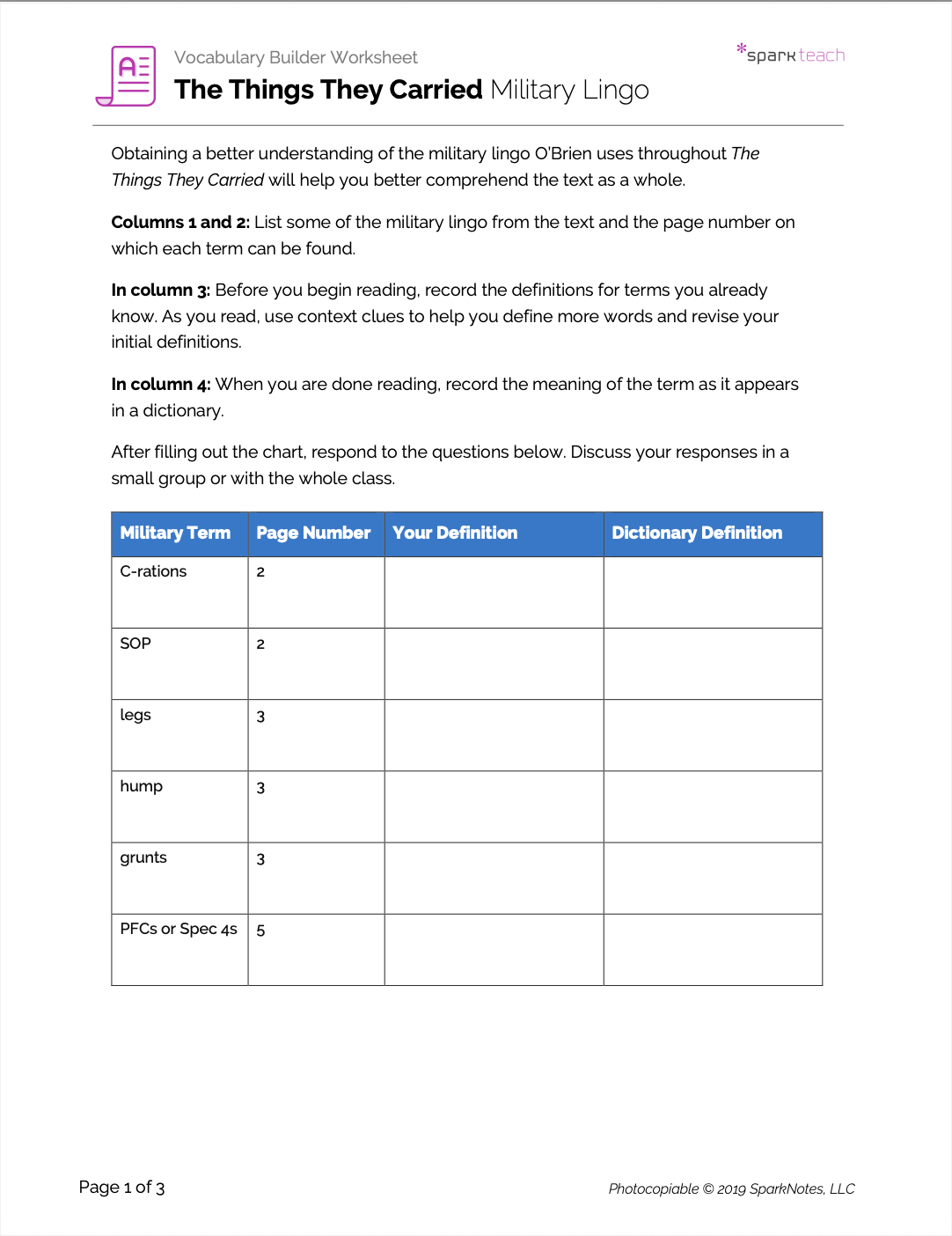The military lingo used throughout The Things They Carried adds to the flavor of the novel and contributes to the sense of its veracity. Students will use this worksheet to practice figuring out meaning of unknown words from context and then expand their knowledge by looking up definitions of specific military terms. They will then reflect on what purpose lingo serves in general, why so much military lingo is used in the novel—especially given that many readers will not be familiar with it—and what kinds of lingo they use in their own lives.