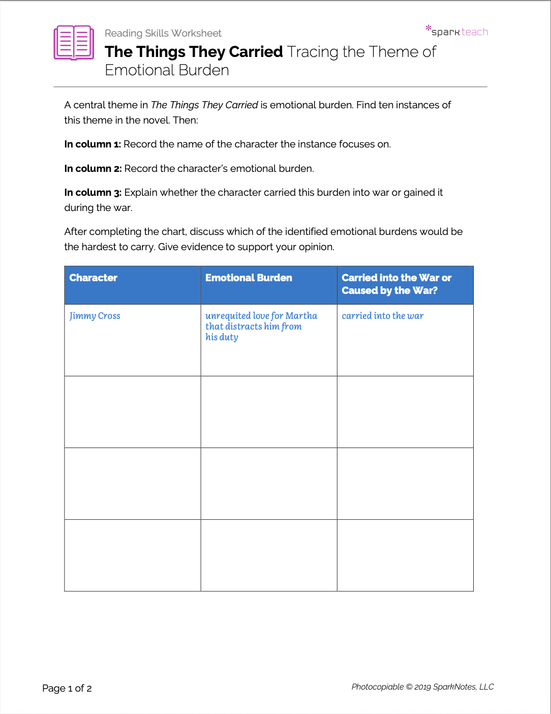 Identifying themes and the evidence that supports them is a key close reading skill students develop through practice. Students will use this worksheet to look for instances of emotional burden, a central theme in The Things They Carried. When students find specific examples of emotional burden in the novel, they will record the burden, the person to whom it belongs, and whether that character carried this burden into war or gained it during the war. You can use this worksheet as students read or after they have completed the text. At the end of the novel when students have finished filling out the worksheet, have small groups discuss what they think would be the hardest emotional burden to carry.