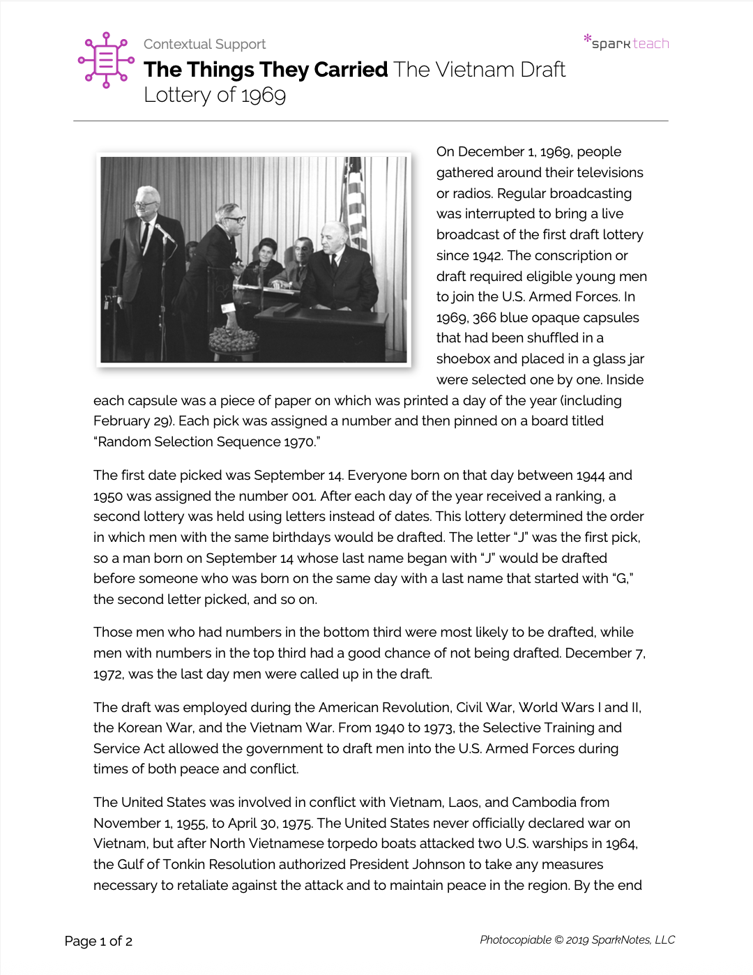 The 1969 draft lottery was a major event in the Vietnam War that was meant to provide more U.S. troops for the war effort and correct the perceived inequities in who was drafted into the U.S. Armed Forces. As we currently have an all-volunteer military, many students may not know about the history of the draft in the United States. This handout provides background information on the draft in the United States, explains the purpose of the 1969 draft lottery, and gives interesting details on how the draft functioned. Use this worksheet to provide students with useful background for The Things They Carried and especially the chapter/story “On the Rainy River.” Encourage discussion and debate in your classroom about the issues described in the handout and allow students to express personal experiences and opinions as appropriate.