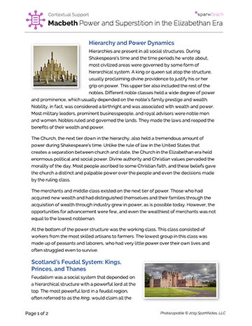 Shakespeare wrote in a time completely different from that in which students are living. This handout provides students with important background information about the political power structures in the Elizabethan era as well as the power of belief in supernatural forces held by most people at the time. Use this handout to spark discussion and debate in your classroom. This is also an opportunity to explore the superstitious beliefs many of us hold despite knowing they are not based in fact. For example, many athletes and sports teams engage in superstitious rituals in the hopes that the practices will increase their chances at winning a game. Use topics such as these to connect your students’ own experiences with the ones of audience-goers in Shakespeare’s time.