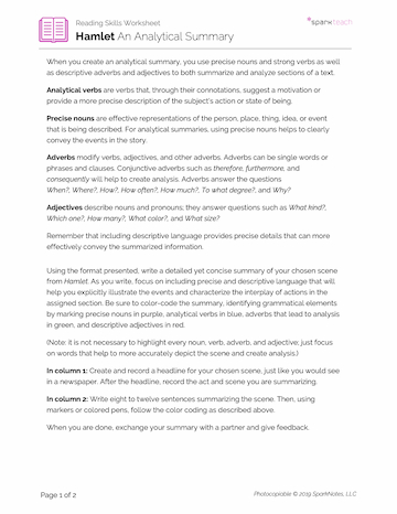 learn how to write an analytical summary of a scene from Hamlet by using analytical verbs,
