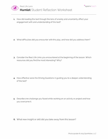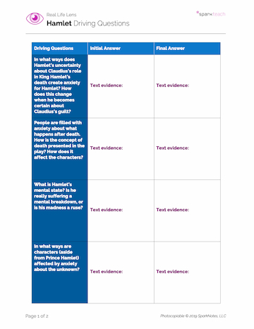 Hand out the Driving Questions Worksheet. Review the questions as a class. Students should enter initial answers to the questions as they read Hamlet. They will revisit the questions and revise their answers following the lesson activities, classroom discussion, and completion of the text. Remind students to support their responses with text evidence.