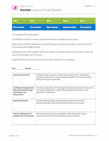 - Use the Literary Circle Review Worksheet to trace the major events of the play through the lens of anxiety and uncertainty, specifically noting the relevant exposition, character interactions, conflicts, resolution, comparisons/poetic devices, and expressions of the theme of uncertainty for each of their assigned scenes.