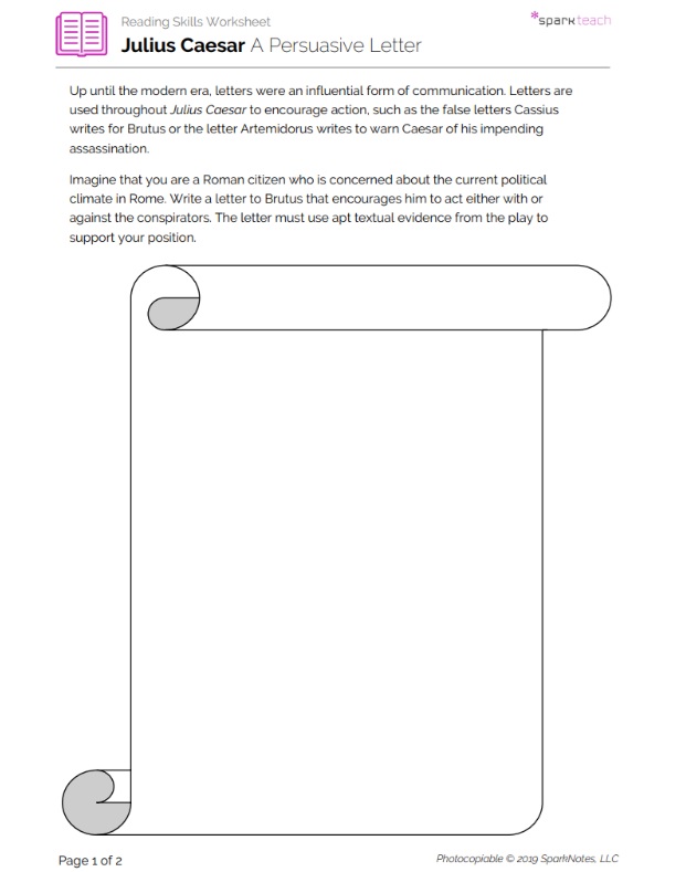 Letters are used throughout Julius Caesar to encourage action, such as the false letters Cassius writes for Brutus or the letter Artemidorus writes to warn Caesar of his impending assassination. Students will use this worksheet to write a letter to Brutus that encourages him to act either with or against the conspirators. Pass out the worksheet after students have finished reading the text and be sure to remind them to include supporting textual evidence in their letters.