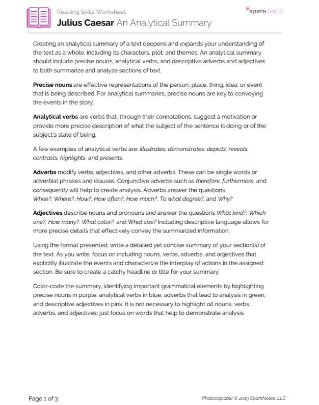 Creating an analytical summary of a text deepens and expands your understanding of the text as a whole, including characters, plot, and themes. Students will use this worksheet to examine what elements make up a strong analytical summary and then produce an analytical summary of Julius Caesar. Pass out this worksheet after students have finished reading the play. You can assign specific scenes and/or lines to individuals or to small groups, or you can allow students to select a portion of the text that they would like to summarize.