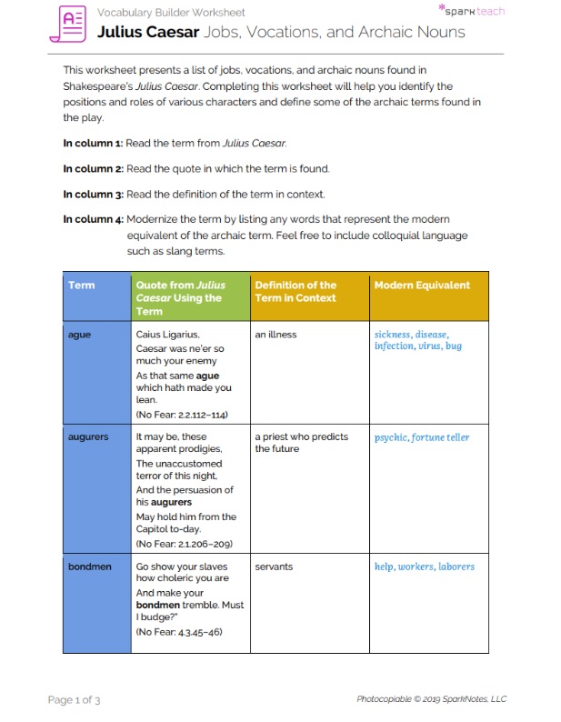Terms from Shakespeare’s time are often unfamiliar today. Gaining a better understanding of such terms deepens a reader’s understanding of a Shakespearean play. Students will use this worksheet to examine some of the archaic terms used in Julius Caesar to help them understand the text and identify the positions and roles of various characters in the play. Pass out this worksheet before students begin reading the play, and have students complete the worksheet as they read through Act 1, as many of the roles and titles of the characters are described within the opening scenes.