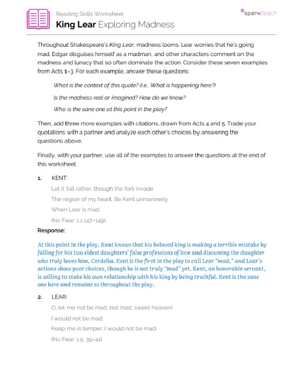 Many critics read King Lear as an exploration of a powerful man’s descent into madness, and, in the subplot, Edgar disguises himself as a madman. Students will use this worksheet to trace this theme of madness throughout the five acts by analyzing several examples from Acts 1-3, and then finding and analyzing additional examples from Acts 4-5. Student pairs will then work together to answer the questions at the bottom of the worksheet.