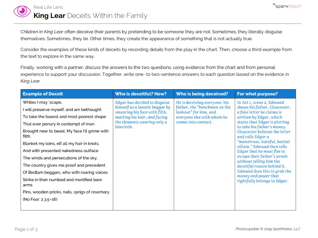 Challenge students to flip their analysis around, analyzing whether and how the parents (Lear and Gloucester) deceive their children in a similar chart. Then have students write a paragraph answering: What are the consequences when parents are dishonest with their children?