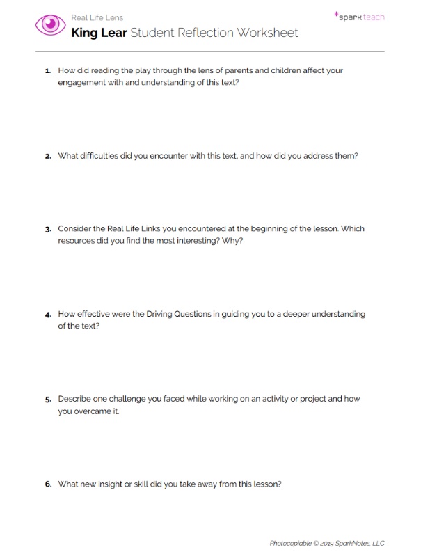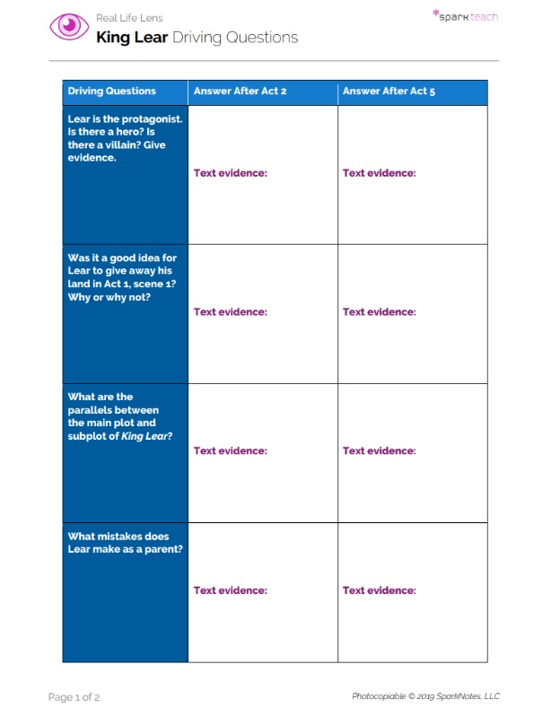 Hand out the Driving Questions Worksheet. Review the questions as a class. Students should enter initial answers to the questions after they read Acts 1 and 2 of King Lear. Then, they will revisit the questions and write new answers after they read the entire play. Remind students to support their responses with text evidence.