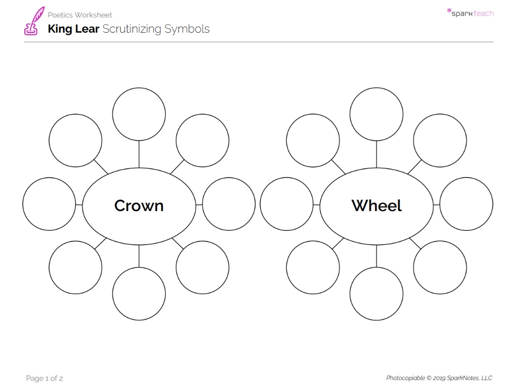 Help students see that a word web is a useful way to explore a symbol by filling in one on the board as a class with the word crown in the middle. Have students return to the exchange between Lear and the Fool, and let them free associate about the word’s possibilities. Record their responses and ideas in the web on the board. Have them fill in the web on their worksheets as well.