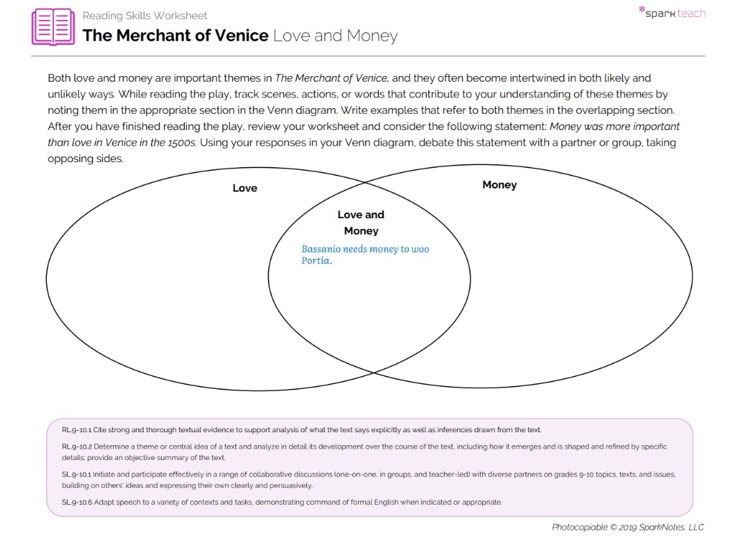 Love and money emerge as important themes in The Merchant of Venice. Students will use this worksheet to track scenes, actions, or words that contribute to their understanding of these themes and analyze how they overlap. Pass out the worksheet before starting the play for students to fill in as they read. Once students have completed the play and the worksheet, have pairs or groups use the debate prompt to conversationally explore the themes of love and money in The Merchant of Venice.