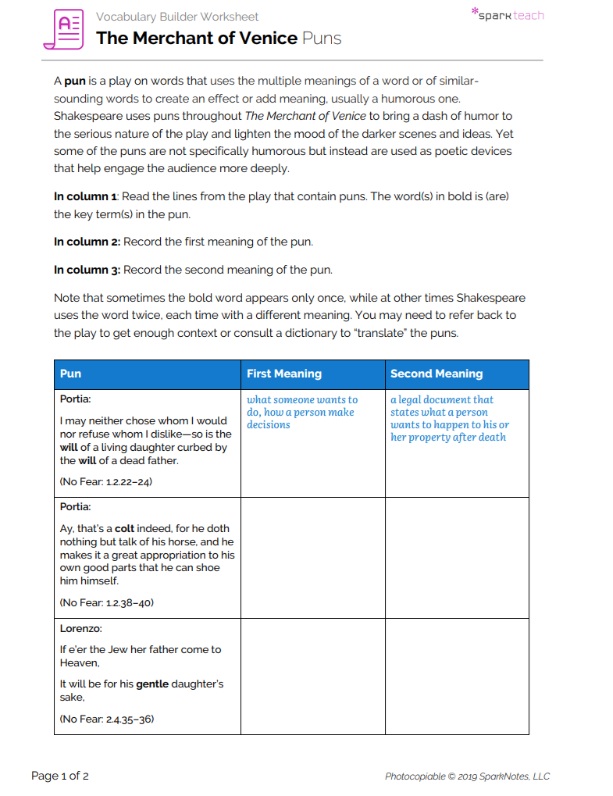 William Shakespeare was a master at wordplay, filling his plays with puns, both funny and serious. Students will use this worksheet to examine some of the puns used in The Merchant of Venice and explore the puns’ dual meanings. You can pass out the worksheet as students begin to read the play and have students fill in the chart as they read or use it as a concluding activity.