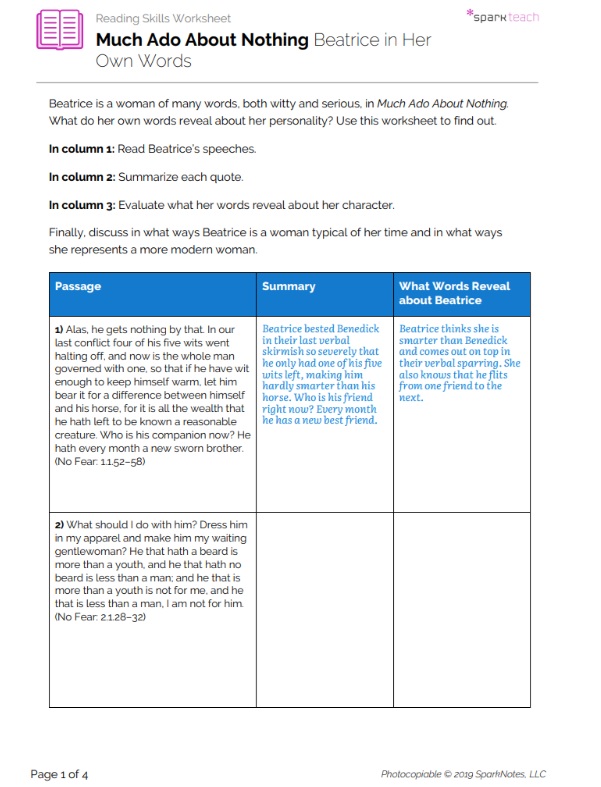 Beatrice is one of Shakespeare’s most famous female characters, and her sparring matches with Benedick create some of his most lively dialogue. Beatrice reveals much of her character and personality through her words. Students will use this worksheet to summarize passages that provide a better understanding of Beatrice and make notes on what her words reveal about her character. Then students will discuss Beatrice’s modernity in small groups. Pass out this worksheet after students have finished reading the play.