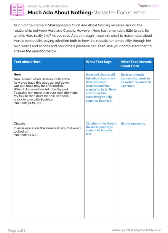 While Hero is a main character in Much Ado About Nothing, she lurks in the background and often remains silent while the drama takes place around her. Students will use this worksheet to uncover the truth about Hero’s personality and character by finding and analyzing relevant passages in the play. Once they have completed the chart, students will evaluate whether or not Hero’s failure to speak out and clear her name is in keeping with her character.