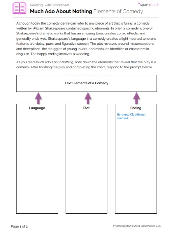 Shakespeare’s plays are divided into categories — comedy, tragedy, and history — and each type of drama has specific elements. Take a moment to review the definition and characteristics of Shakespeare’s comedies with students. Then have students use this worksheet to find and list the comic elements in Much Ado About Nothing. Finally, have students respond to the prompt, taking a position as to whether the play is actually a Shakespearean tragicomedy. Students can write responses or discuss the prompt in small groups or as a class. Pass out this worksheet before students begin reading the play.