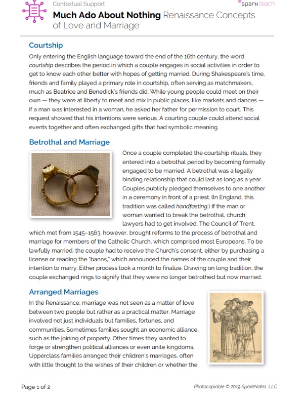 Much Ado About Nothing draws much of its plot, humor, and drama from the rituals and social mores surrounding courtship, love, and marriage. This handout provides relevant background information about basic concepts that were crucial to the development of matrimonial relationships during the Renaissance. Use this handout to ensure that students understand how marriage rituals were both different in Renaissance times and were reflected in Shakespeare’s work. Discuss the content as a class, and allow students to offer personal opinions and make cross-curricular connections.