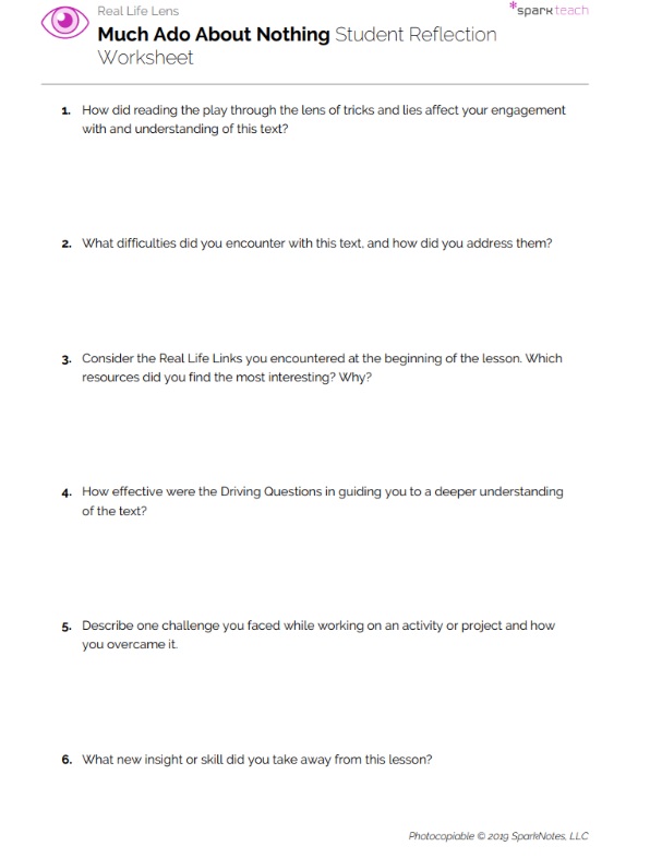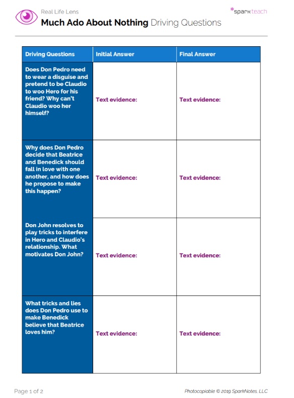 Hand out the Driving Questions Worksheet. Review the questions as a class. Students should enter initial answers to the questions as they read Much Ado About Nothing. They will revisit the questions and revise their answers following the lesson activities, classroom discussion, and completion of the text. Remind students to support their responses with text evidence.