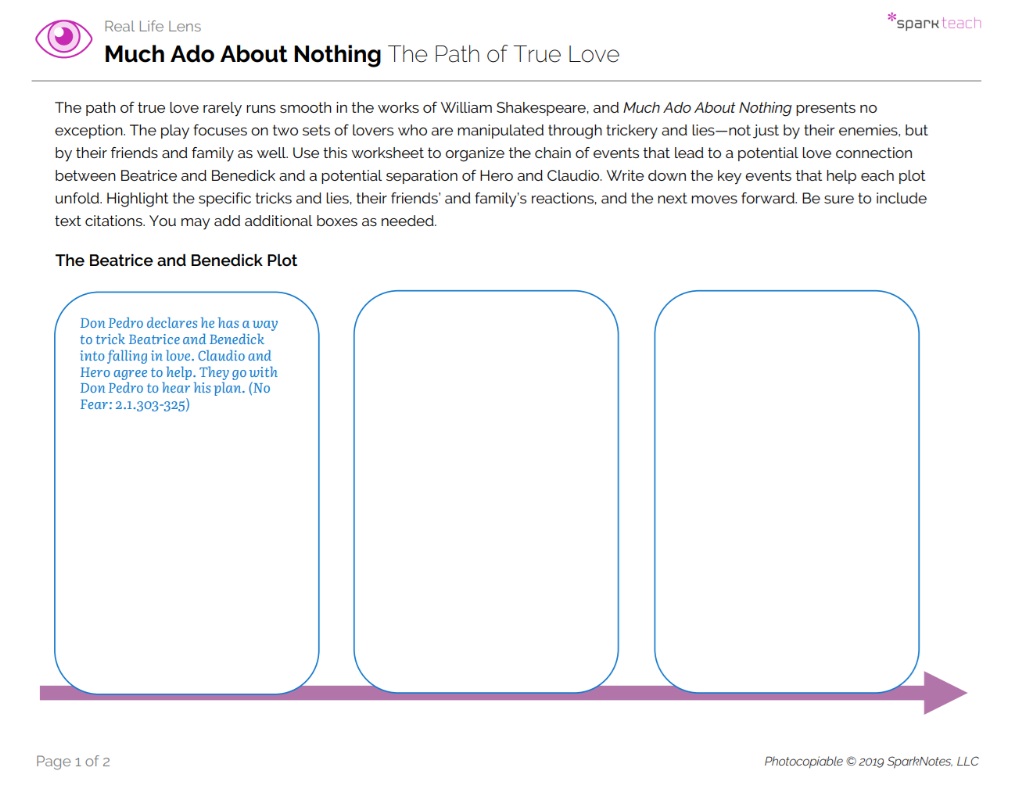 Before reviewing the text, work with the class to recall how the dual plots unfold. Ask questions such as: Whose idea was it to make Beatrice and Benedick fall in love? What was the plan? What happened after the plan was introduced? Who initiated the plot to divide Hero and Claudio? What was the plan? What actions did this person take? Write each chain of events on the board. Then organize students into small groups to find the text that supports each of these events and add more details. Students will complete their charts together and then proceed to discussion.