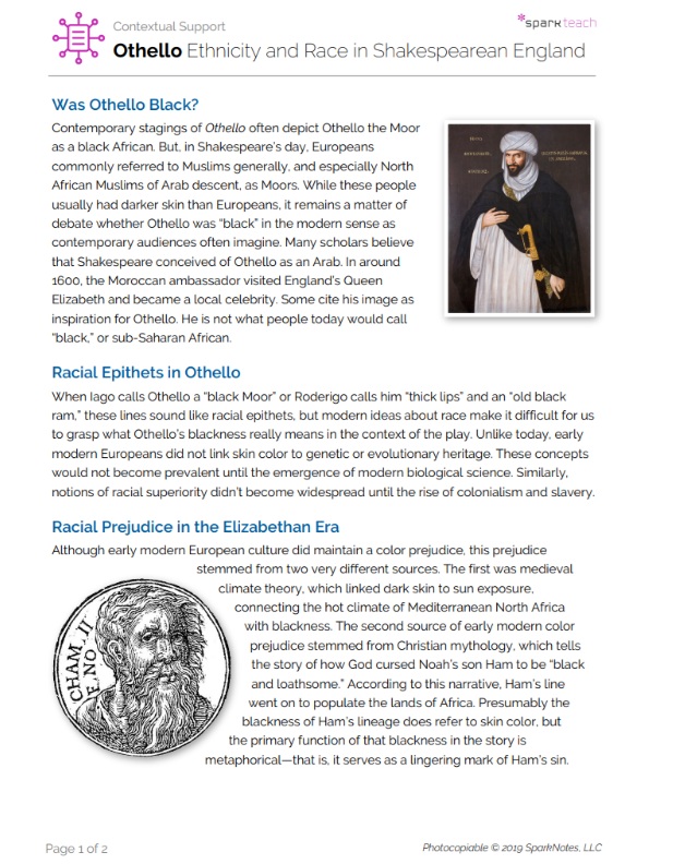Shakespeare wrote in a time completely different to that in which students are living. This handout gives students important background information about the idea of race in the Elizabethan era and traces evolving views of Othello through different historical points. Use this handout to spark discussion and debate in your classroom and allow students to express personal experiences related to the issues described.