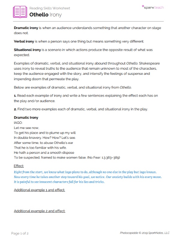 Understanding irony is a key component of many literature exams and learning standards. Students will use this worksheet to explore how dramatic, verbal, and situational irony affect the play’s meaning and the audience’s experience with the story. Pass out this worksheet after the class has finished reading the play. Take a moment to review the definitions of dramatic, verbal, and situational irony. If time is a limiting factor, assign small groups to work together to complete the worksheet.