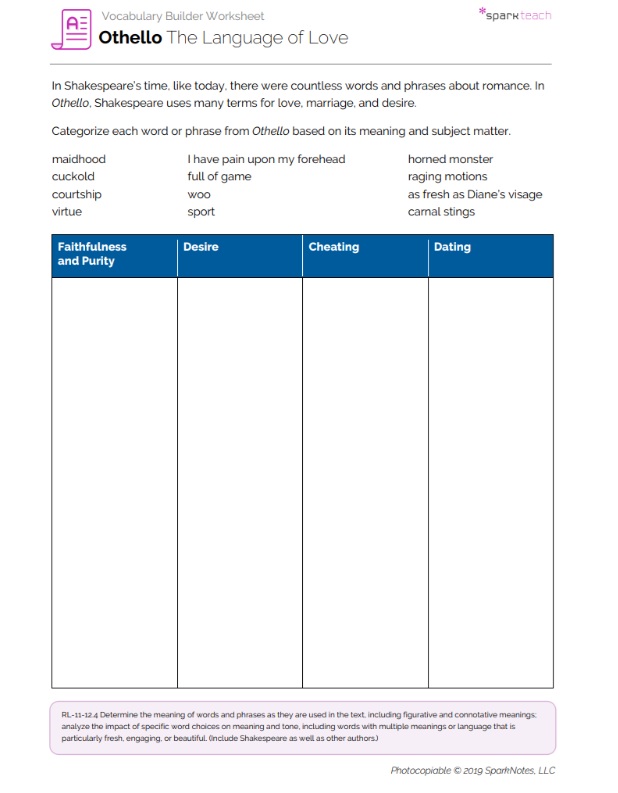 All people explore the concept of love in their lives, regardless of nationality, ethnicity, or even the era in which people live. This worksheet helps students identify and understand the language of love in Shakespeare’s time and relate that language to their own experience today. Instruct students to record each word from the list in its correct category in the graphic organizer. Students can continue working throughout the reading of Othello. Students may work independently, in pairs, or as a class.