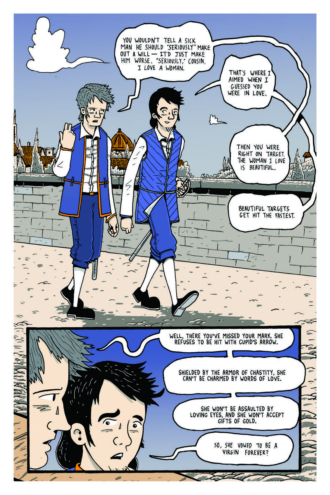 Shielded by the armor of chastity, she can't be charmed by words of love.