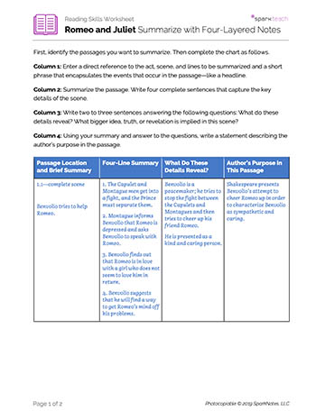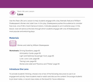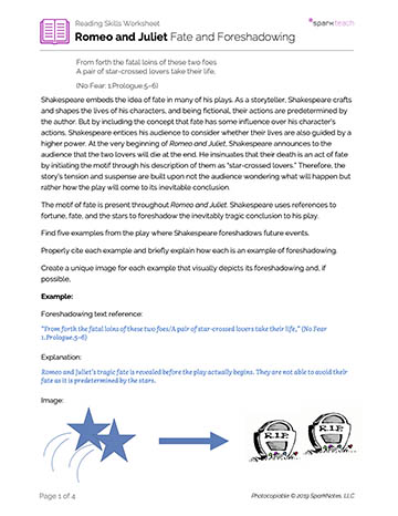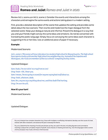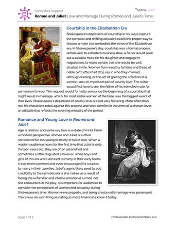 SparkTeach is a unique set of teaching guides designed to help make classic literature engaging and relevant to today’s students. Whether you are teaching in the classroom or guiding distance learning, our materials are easily customizable and meant to be adapted for your students. Explore our free sample content for Romeo and Juliet, then buy the full teaching guide to get even more resources.