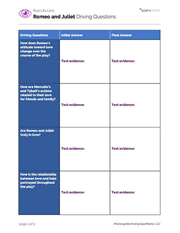 Hand out the Driving Questions Worksheet. Review the questions as a class. Students should enter initial answers to the questions before and as they read Romeo and Juliet. They will revisit the questions and revise their answers following the lesson activities, classroom discussion, and the completion of the text. Remind students to support their responses with text evidence.