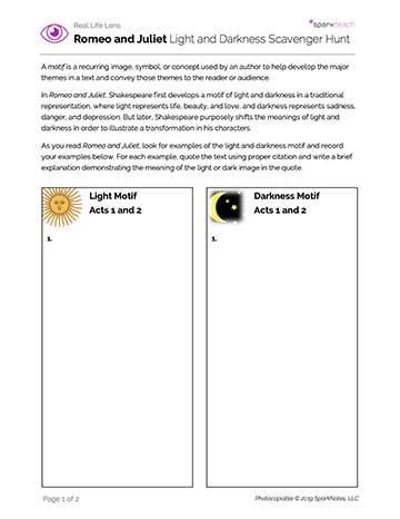 To help students better understand the concept of motifs and how Shakespeare uses certain motifs to reveal meaning, pass out the Light and Darkness Scavenger Hunt Worksheet prior to reading the play. Review how to use the worksheet with students, and then have students fill out the worksheet as they read the play.