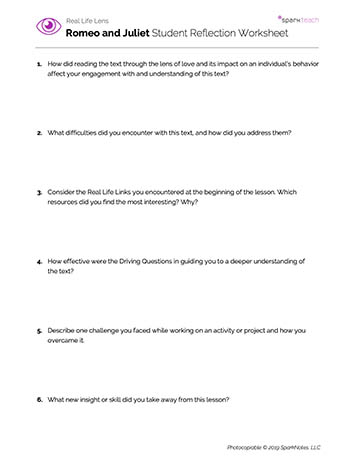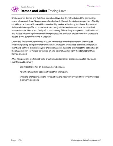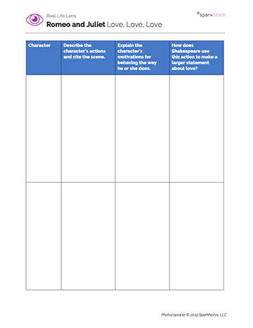 Nearly every event and character’s actions in Romeo and Juliet can be connected to some aspect of love. For this activity, students will be asked to use the Love, Love, Love Worksheet to: