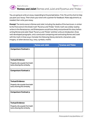 Students will read Ovid’s myth “Pyramus and Thisbe” and then fill out the chart titled Romeo and Juliet and “Pyramus and Thisbe." Students will use their completed chart to help them respond to the following prompt, which asks them to compare and contrast scenes from “Pyramus and Thisbe” with scenes from Romeo and Juliet.