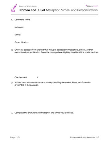 Students will identify examples of metaphors, similes, and personification in William Shakespeare’s Romeo and Juliet and explain how and why these poetic devices are used to convey the complex emotions of the characters. The accompanying worksheet can be completed numerous times as students read the text.