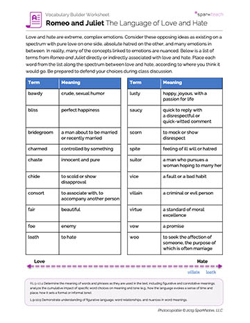 Language expressing the emotions of love and hate has been used throughout the history of humanity. Students will use this worksheet to explore words used in Shakespeare’s time that are related in some way to either love or hate. Review the list carefully with students, explaining each of the words and its meaning. Then have students place each word on the spectrum based on the word’s meaning relative to love and hate. Finish with a class discussion in which students compare their spectrums and defend their choices.