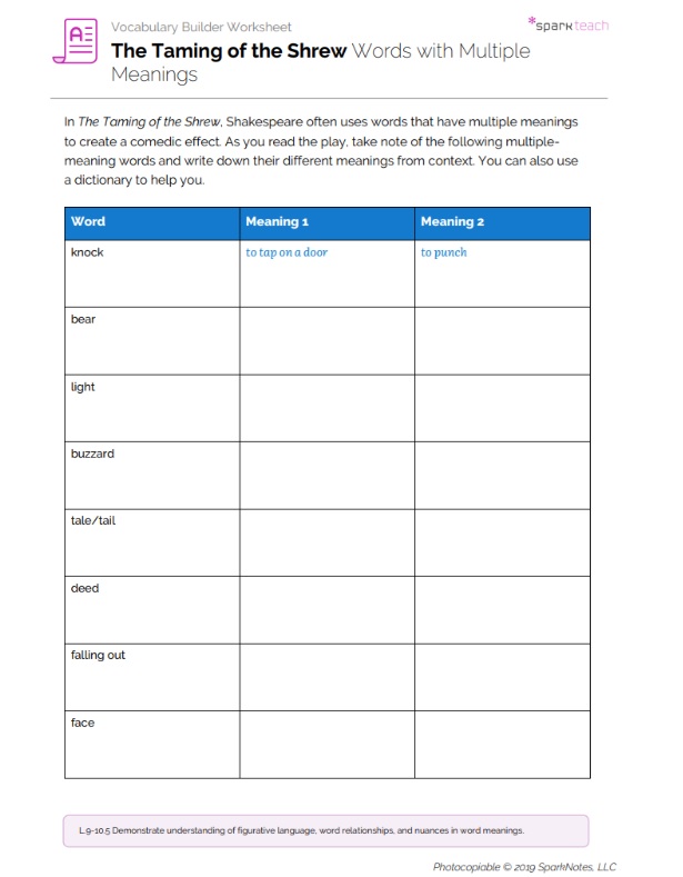 Just as he uses puns to add meaning and humor in The Taming of the Shrew, Shakespeare uses words with multiple meanings to create a comedic effect. Students will use this worksheet to keep track of the multiple meanings of specific words, some of which are antiquated, throughout the play. Pass out this worksheet before students begin reading the play. You can also allow students to use dictionaries to find meanings.