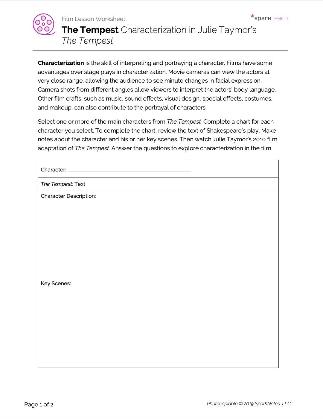 3. After students watch the film, pass out the worksheet Characterization in Julie Taymor’s The Tempest. Have students choose one of the major characters from the play and fill out the chart accordingly. Remind students to review their notes from the class discussion for details about characters in the text. If students want to explore characterization of more than one character, have them copy the blank chart in their notebooks.