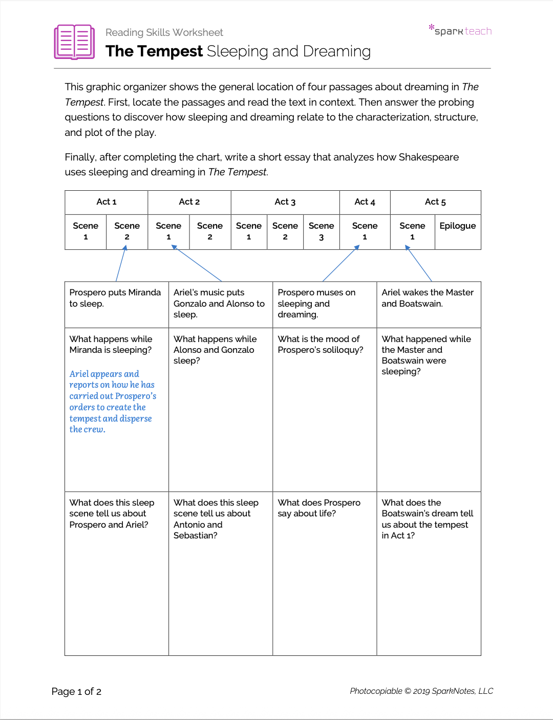 In The Tempest, Shakespeare uses sleeping and dreaming as literary motifs and as structural and plot devices. Students will use this worksheet to find four passages about dreaming. They will review the text and then answer probing questions to discover how sleeping and dreaming relate to the characterization, structure, and plot of the play. Students will enter their notes in a chart. After completing their charts, students will write short essays that analyze how Shakespeare uses sleeping and dreaming in The Tempest. Pass out this worksheet after students have finished reading the complete text.